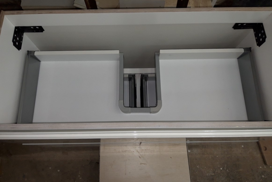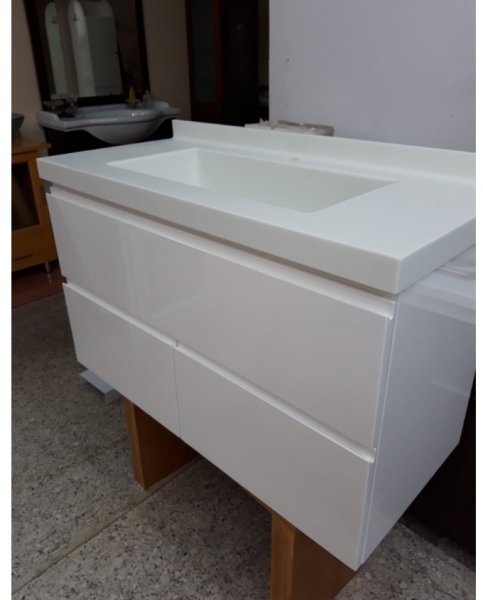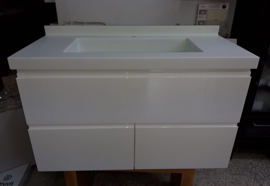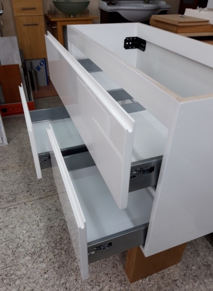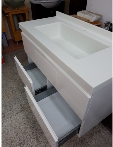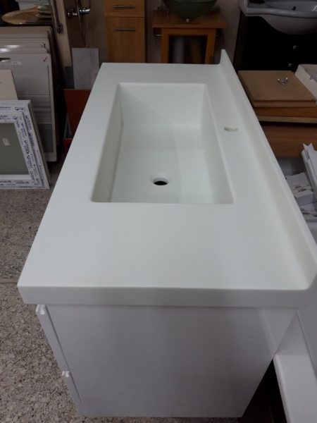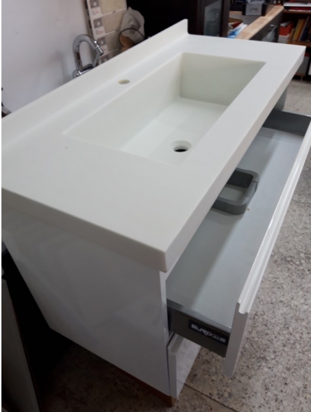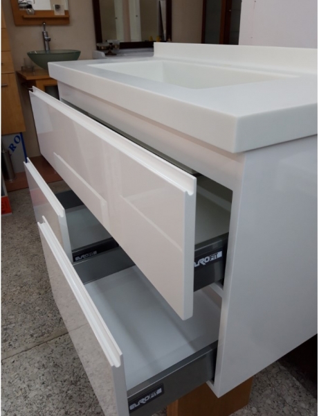 Έπιπλο μπάνιου κόντρα πλακέ θαλάσσης, λευκή λάκα γυαλιστερή, με corian νιπτήρα.